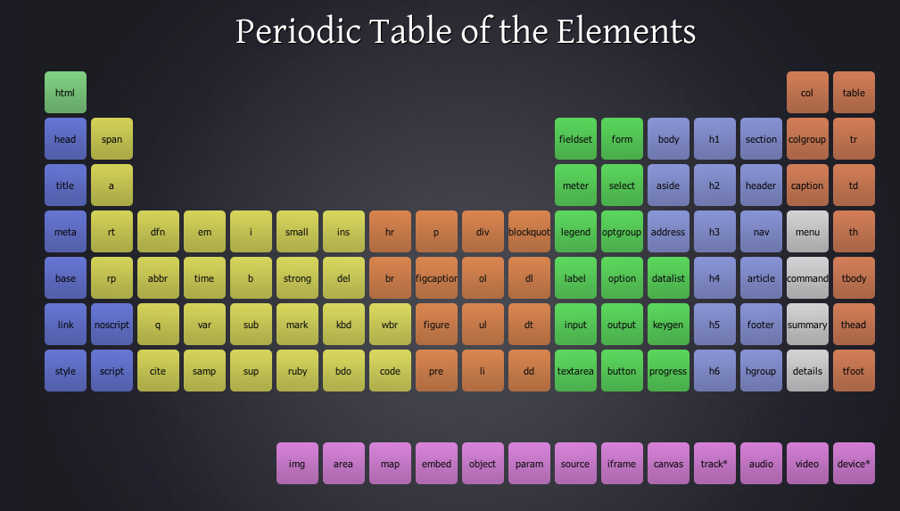 I recently came across this periodic table of valid HTML elements. So if you’re building websites; aren’t sure if the tag you are using is allowed; or just want to explore your knowledge of HTML markup take a look! You never know you might just find a tag that you didn’t know existed and it might solve a problem that has been bugging you for months. Enjoy!