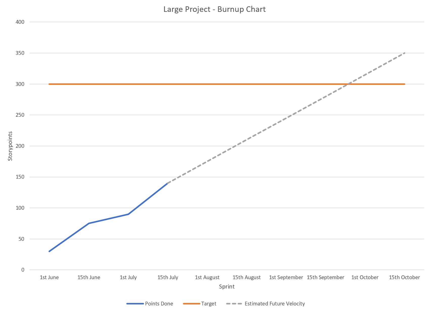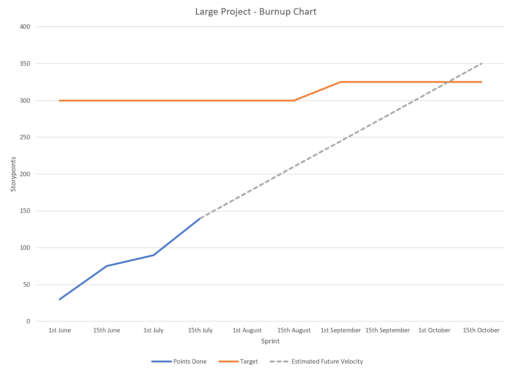If scope changes part way through a delivery you can adjust the target line to reflect the point in time that the scope changed. This also gives an indication of how much extra work has been introduced.